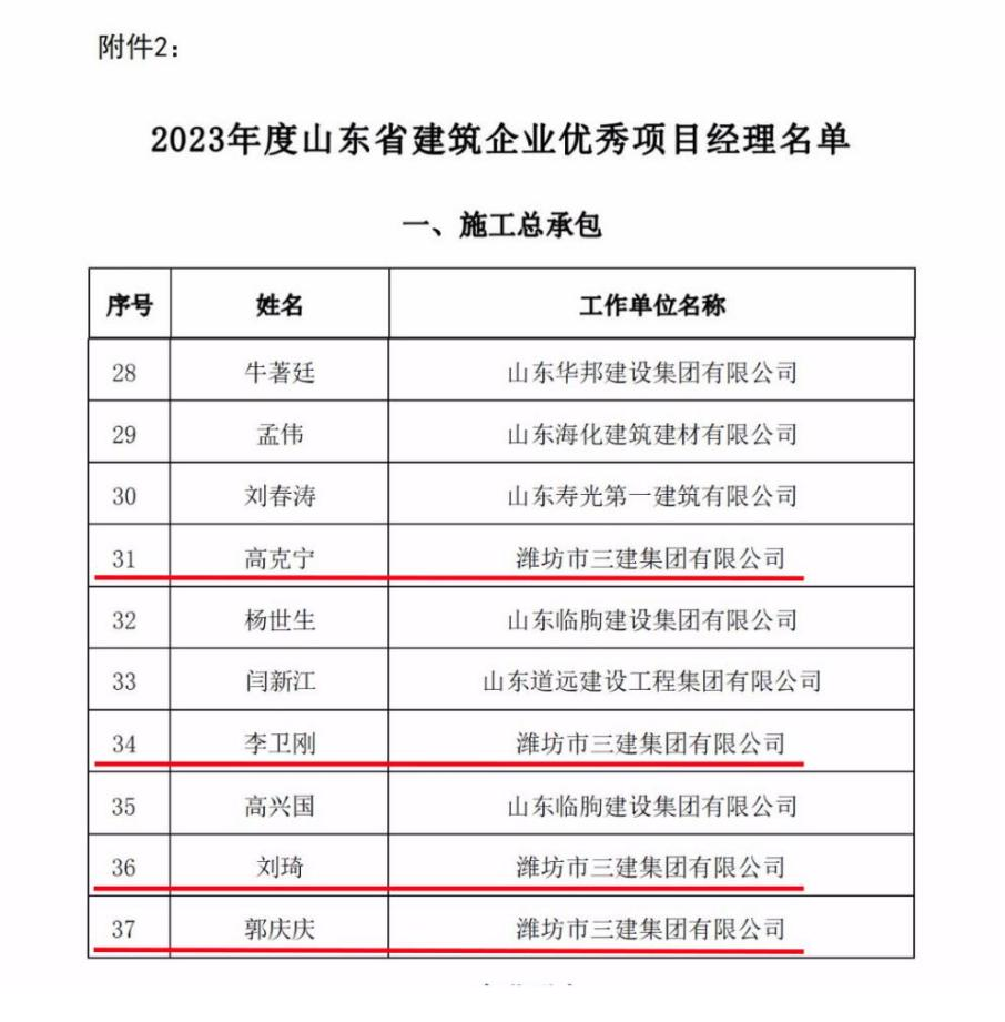 近日,山東省建設(shè)工會、山東省建筑業(yè)協(xié)會下發(fā)《關(guān)于公布2023年度山東省建筑業(yè)企業(yè)優(yōu)秀項目經(jīng)理勞動競賽獲獎名單的通知》,集團(tuán)公司高克寧、李衛(wèi)剛、劉琦、郭慶慶四人通過單位申報、競賽工作委員會評議審定和綜合評審,被授予“山東省建筑業(yè)企業(yè)優(yōu)秀項目經(jīng)理”稱號。